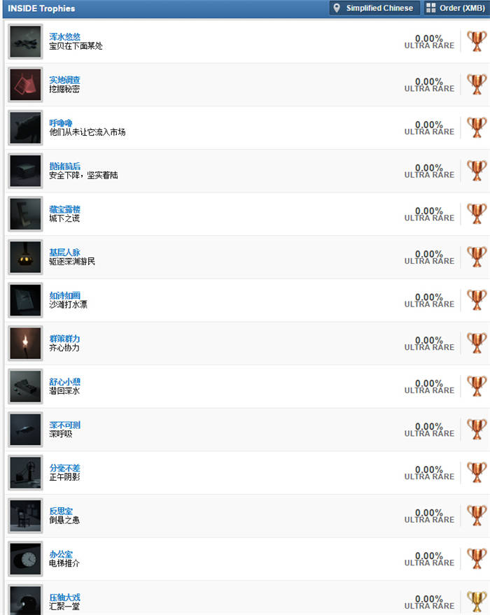 今日奖杯网站psnprofiles页面显示,IGN满分神作,由《地狱边境(Limbo)》开发商Playdead工作室开发的2D动作解谜游戏《Inside》或将登陆PS4平台,同时公布了PS4版《Inside》的奖杯列表。《Inside》是一款解谜游戏,玩家在游戏中需控制一名小男孩探索一个超现实的环境,而游戏画面主要是黑白色、2.5D及利用一些溅出的颜色来突出部分环境。玩家能控制小男孩作出走路、跑、游泳、攀爬及使用物件等动作来进行游戏,在游戏中期小男孩更会获得能力,能精神控制死尸并操纵他们以解决各种谜题。
