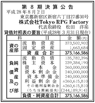 《祭祀与雪之刹那》开发工作室Tokyo RPG Factory赤字亏损高达2亿4400万日元