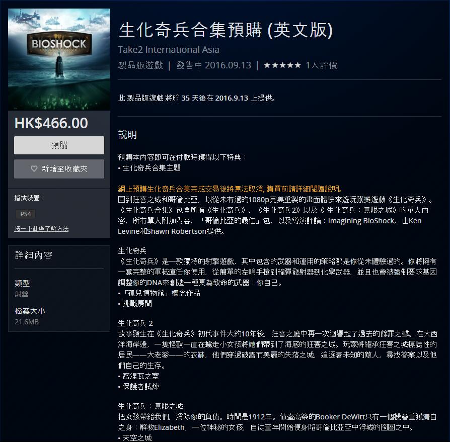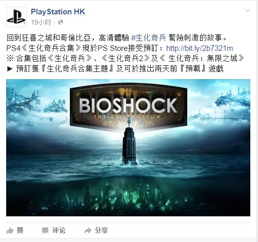PlayStation HK官方脸书账号今日发出消息,《生化奇兵:合集》正式在港服PSN推出预购,售价466港币。本作将包含《生化奇兵》、《生化奇兵2》、《生化奇兵:无限》及他们的所有DLC内容。可惜的是,PSN商城所给出的为英文版,并且在PlayStation HK官方账号的回复中不难看出,2K似乎并没有将本作进行中文化的打算。。。