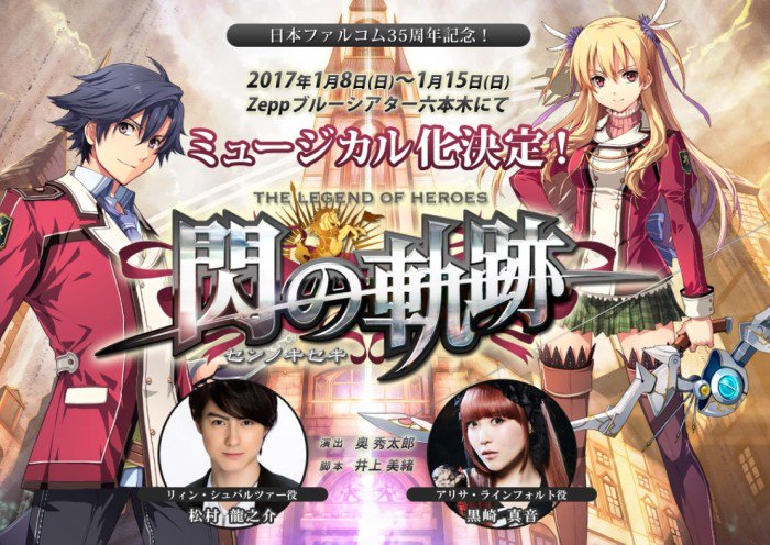 Falcom近日宣布《英雄传说:闪之轨迹》将改编成音乐剧,这场音乐剧将于2017年1月公演,剧本为曾经参加过《请问今天要来点兔子吗?》等剧本制作的井上美绪撰写,以下为舞台剧的宣传海报,男主角黎恩由松村龙之介扮演而女主角亚丽莎由黑崎真音扮演。