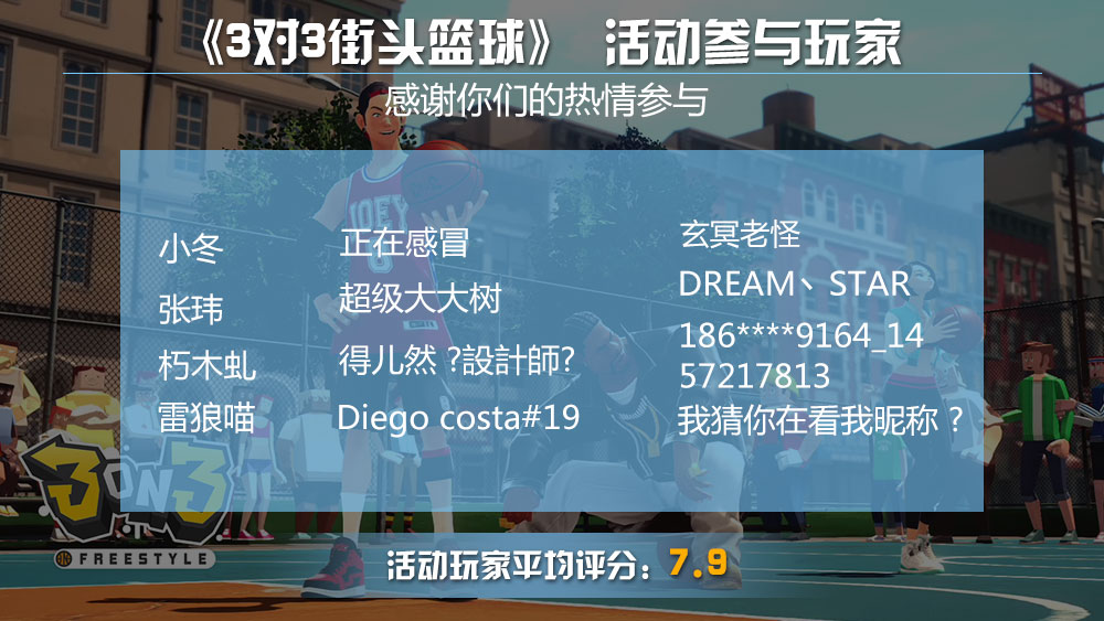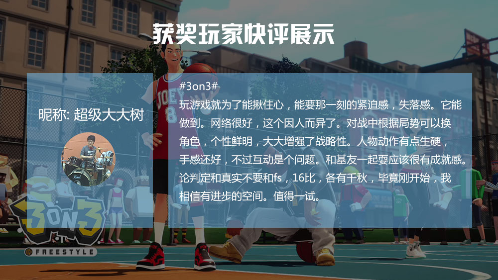 《3对3街头篮球》MVP正在火热进行中,相信不少街球爱好者已经在球场上挥洒成吨的汗水了。我们的“3大活动助你爽玩3on3”于今日正式落下帷幕,奖品“官方限量FS球衣”也找到了各自的主人。游戏快评的获奖者来源于用户“超级大大树”,他客观理性的评论值得各位参考。炫图活动的获奖者用户昵称是“我猜你在看我昵称?”,他的截图成功捕捉到了游戏角色“金”投篮出手的瞬间,定格了那刹那的美好。攻略活动的话很遗憾并没有任意一篇投稿达到我们的发布标准,所以获奖者只能空缺了。在此感谢所有参与玩家对活动的大力支持,也请获奖用户留意自己的通知中心查看领奖方式。《3对3街头篮球》MVP测试将在9月12日结束,感兴趣但还没尝试过的玩家可别忘记前往PSN商店下载体验哦~