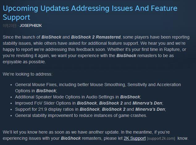 2K承诺会在接下来修复《生化奇兵》重置版的PC版本问题