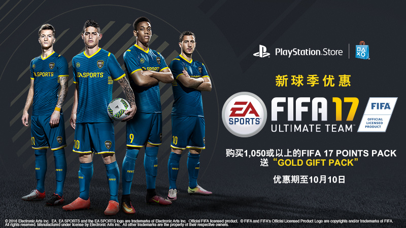 PlayStation香港今日宣布《FIFA 17》新球季优惠活动开启!由即日起至10月10日,购买任何一款1050或以上的PS4 FIFA 17 Points组合包可获 “黄金礼品组合包”一个。新一年的EA SPORTS FIFA 17足球赛季现已展开,球迷们最爱的FIFA Ultimate Team亦增加了多项新功能,包括组建球队挑战,FUT Champions及FUT 球衣。