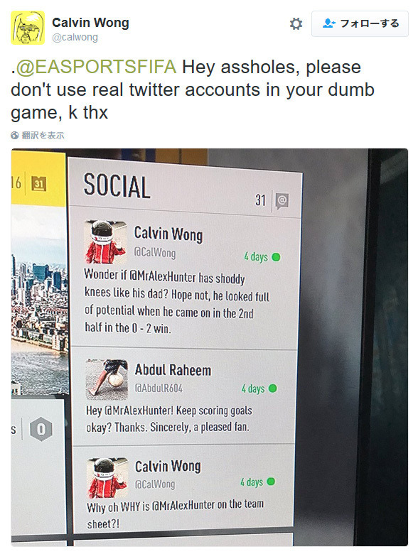 我们都知道EA在最新发售的《FIFA 17》中加入了故事模式,玩家将在该模式中扮演新人球员阿莱克斯·亨特,并且游戏中还设置了一个类似推特的模拟社交平台,其中亨特有一个粉丝ID为@CalWong。巧合的是在现实推特中恰巧存在一个同样的ID用户,随后CalWong在推特上联系了EA并要求将其ID名从游戏中删除,然而EA对此没有作出任何表态,而且CalWong这一举动还招致了许多不理性的FIFA玩家对其进行辱骂。无可奈何之下,CalWong只能通过律师联系了EA,而最终EA向CalWong进行了道歉,并表示之后会通过补丁的方式将他的ID从游戏中删除。