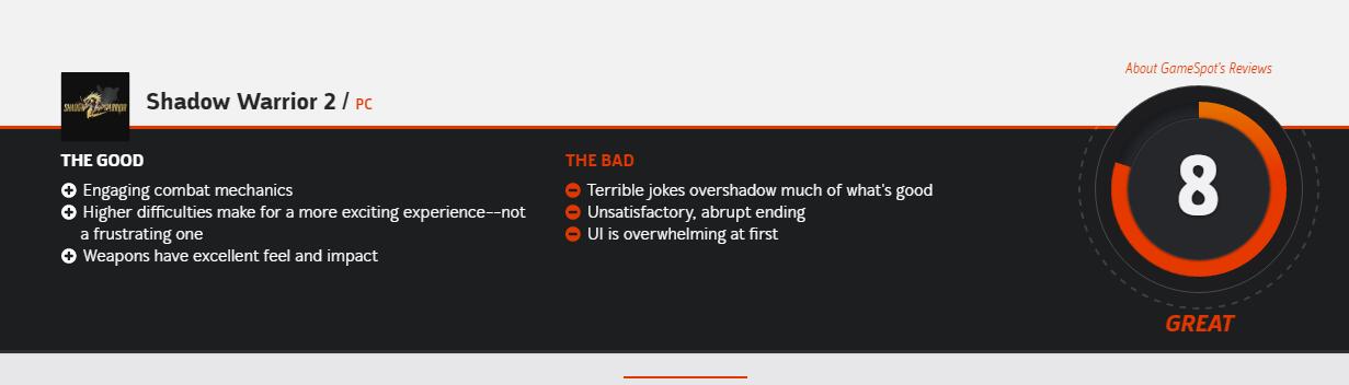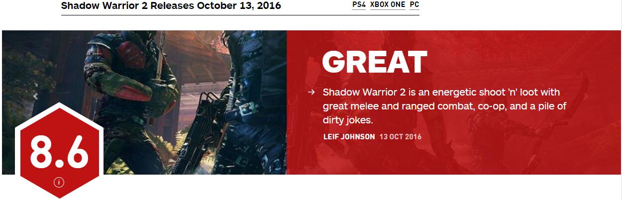 《影子武士2》已于昨日正式登陆PC平台,IGN以及GameSpot今日均对本作进行了评测。IGN方面为本作打出了8.6分的优秀成绩,并给出评语:游戏拥有近战以及远程等多元化的爽快战斗、战利品获取也足够丰厚。合作模式以及污污的笑话更是添砖加瓦!GamSpot方面则为游戏给出了8分的评价,并表示:游戏的战斗机制出色,高难度下的游戏体验更是卓越,并且武器手感极佳。而不足之处则是让人尴尬的低俗笑话,不那么令人满意的结局,以及游戏初期略微喧宾夺主的UI。