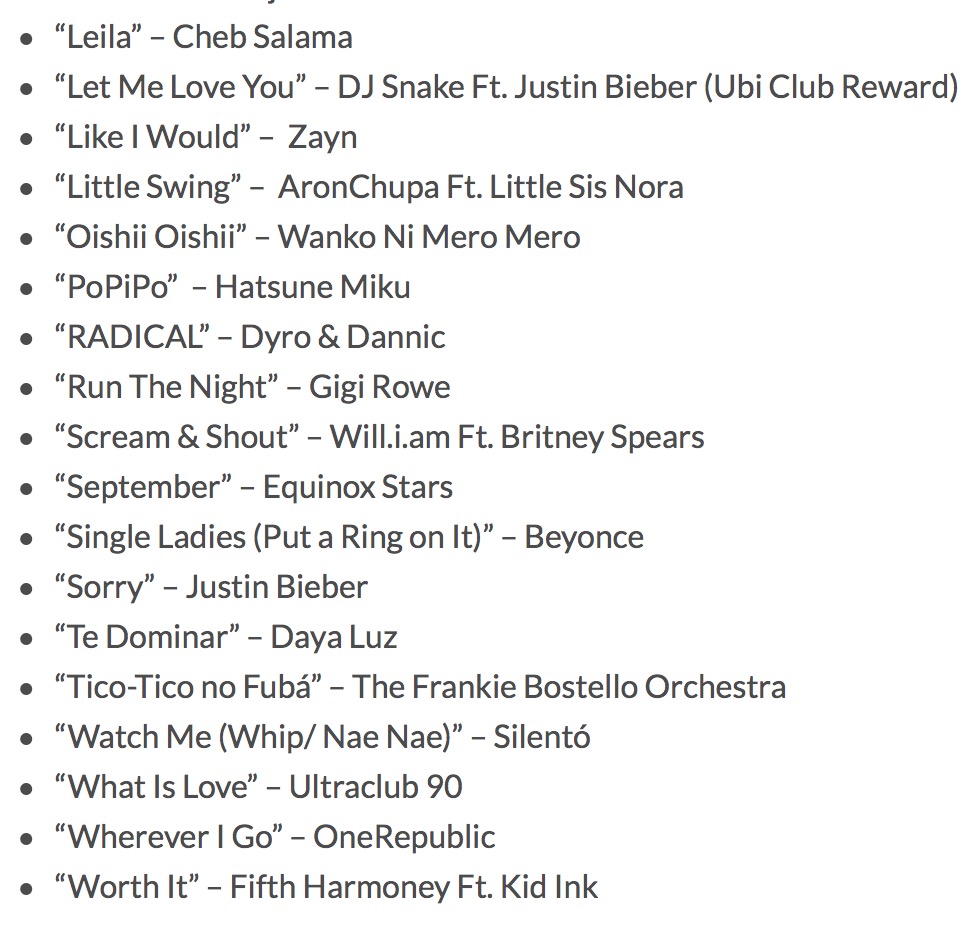 育碧今天公布了《舞力全开2017》的完整收录曲目内容。新作舞力全开共收录了超过40首热门歌曲,为系列目前为止变化最丰富的歌曲清单。拥有例如希雅(Sia)与肖恩·保罗(Sean Paul)合唱的“Cheap Thrills”、贾斯汀·比伯(Justin Bieber)演唱的“Sorry”,还有皇后乐队(Queen)演唱的“Don't Stop Me Now”等热门歌曲,以及Wanko Ni Mero Mero演唱的“Oishii Oishii”这类古怪俏皮歌曲。