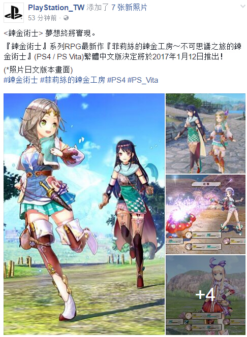 PlayStation台湾今日宣布PS4/PSV《菲莉丝的工作室:不可思议之旅的炼金术士》中文版将于2017年1月12日发售