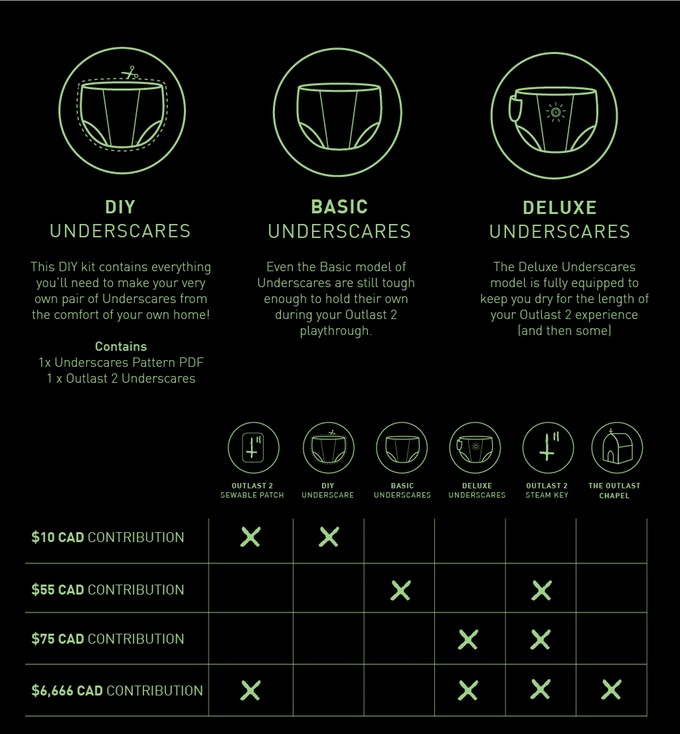 玩恐怖游戏经常被吓尿怎么办?近日恐怖游戏《逃生》系列开发商Red Barrels就在Kickstarter上开启了一款恐怖游戏专用纸尿裤的众筹,据Red Barrels表示自从《逃生》发售以来便一直收到许多玩家“被吓尿”的反馈,所以他们特意为玩家们制作了这款专业的“恐怖游戏纸尿裤”。在众筹款项中,除了Red Barrels最为推荐的55加元组合外(内含普通版纸尿裤+《逃生2》steam激活码),还设有价值6666加元的最强套组(约33883人民币),其中包含《逃生》的经典标志缝纫补丁、豪华版纸尿裤、《逃生2》steam激活码以及一个《逃生》中教堂的大比例模型。
