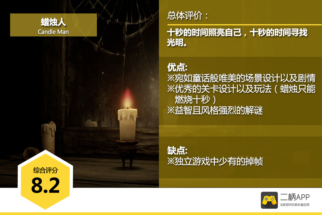 #微评测#初见《蜡烛人》是在2015年的Chinajoy会场Xbox展台的试玩区,它也是那年我唯一记忆深刻的国产主机游戏。今天,这款作品终于登陆了国行Xbox One,提前拿到游戏的小编也有幸为大家带来这篇微评测。游戏的核心是在每一个关卡中到达终点,而在其过程中蜡烛人需要战胜黑暗、点亮其他烛火、或是解开阻挡去路的谜题。游戏的画面、剧情、音乐均达到了业界顶级独立游戏的水准,而每关10条命、每条命只有10秒燃烧时间的设定让原本并不那么艰难的旅途增添了大量不确定性以及可能性。总体来说,本作水准一流,但独立游戏中少有的掉帧现象却让人有些无法忽视。二柄综合评分:8.2分。