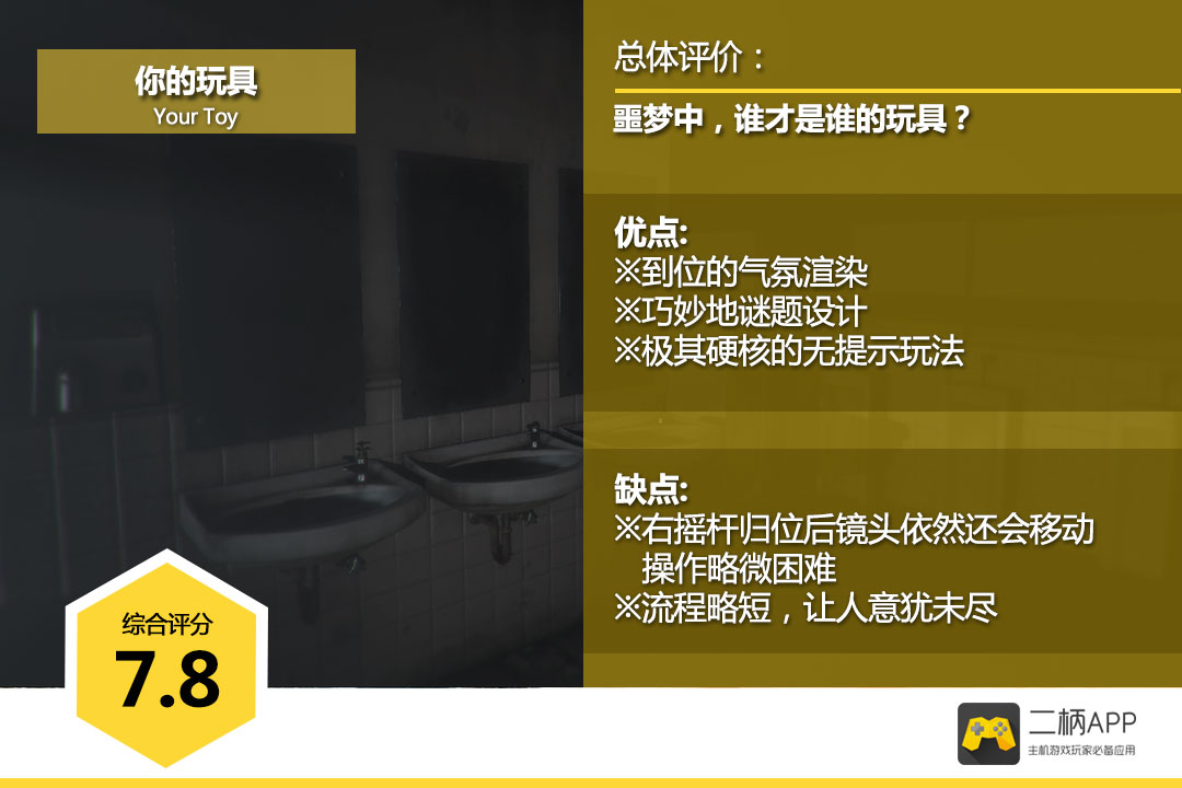 #微评测#同样是在2015年ChinaJoy上崭露头角,也同样选择了今天发售,来自于万岁游戏的《你的玩具》却充满了诡异与惊悚的调调。压抑的气氛加上昏暗的画面,更让人窒息的其实是游戏中毫无提示以及引导带来的无助感。主打硬核解密外加惊悚气氛的本作可以说很好的完成了任务,以至于小编每隔一段时间就得强迫自己离开游戏舒缓一下心情(一半因为害怕,一半因为卡关)。可惜的是,本作的流程有些短小,正当小编觉得自己已经对本作驾轻就熟的时候,它就这么突然地结束了。此外,另一个不得不吐槽的问题就是游戏的镜头控制过于滑溜,在刚开始游戏的那段时间里,捡起地上的一个线索竟成了一件考验操作的事,不免让人有些烦躁。当然,如果你对自己的智商以及心理素质足够有信心的话,《你的玩具》会是一个不错的选择。二柄综合评分:7.8分。