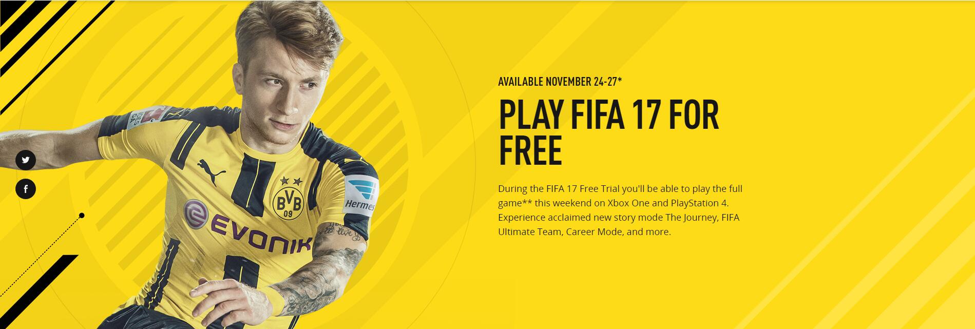 EA Sports今日宣布,《FIFA 17》将在本周末,美国时间11月24日-27日推出限时免费试玩!届时,《FIFA 17》中的所有模式都将免费对所有玩家开放。而免费的平台为PS4以及Xbox One。