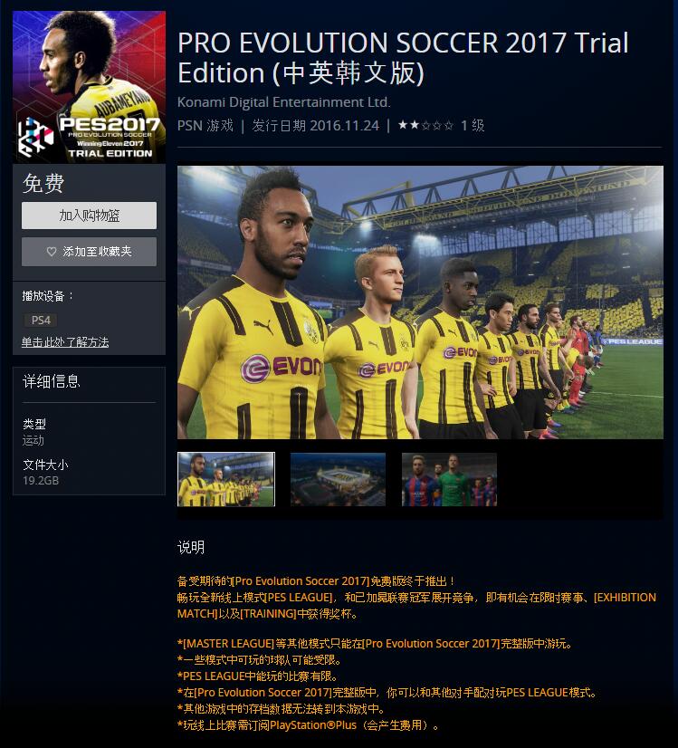 港服PS Store今日正式上架了《实况足球2017》的免费版。在免费版中玩家可以畅玩全新的线上模式“PES LEAGUE”、快速比赛以及训练模式。当然免费版中玩家可用的球队将受到限制。