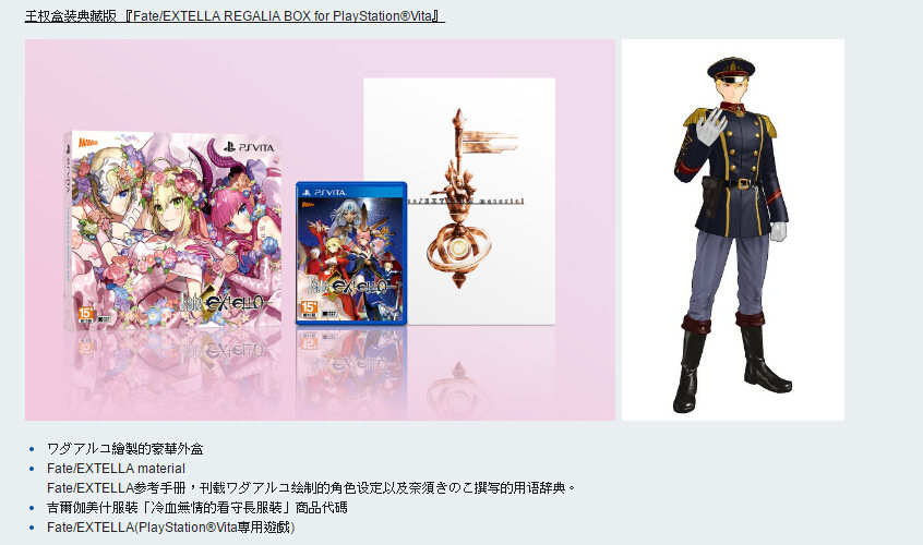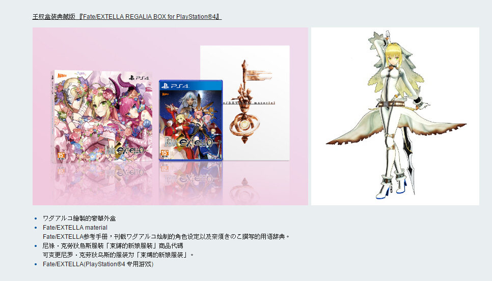 Fate全新动作游戏《Fate/EXTELLA》繁体中文版确定将于2016年12月15日发售。本作的繁體中文版将推出普通版与限定版。限定版中除了包含刊载ワダアルコ绘制的角色设定以及奈须きのこ(奈须蘑菇)撰写的Fate/EXTELLA参考手册中文版之外,PSV版与PS4版还将分别附上不同种类的商品代码。