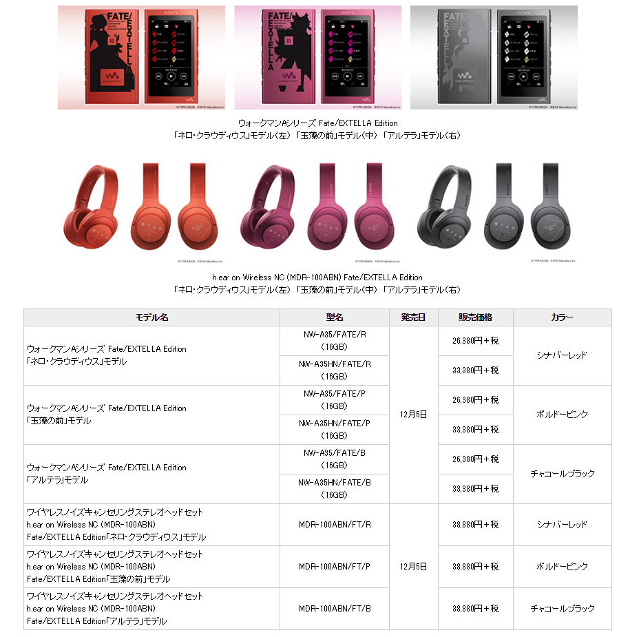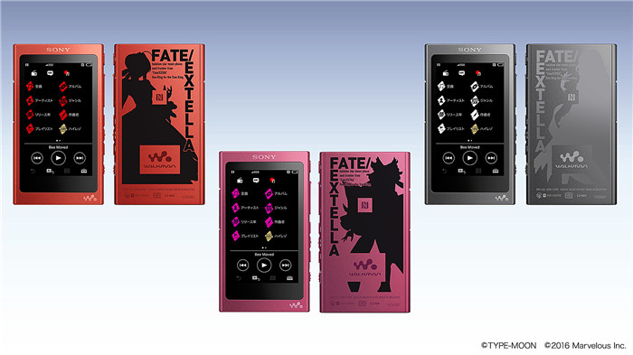 SONY今日宣布在2016年12月5日~2017年1月31日期间将限定数量发售《Fate/EXTELLA》联动产品,分别有尼禄、玉藻前、阿提拉3款不同的配色,其中NW-A35(16GB)售价26380日元+税、NW-A35HN(16GB)售价33380日元+税、MDR-100ABN售价38880日元+税。