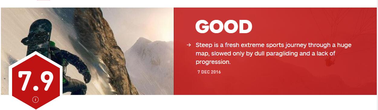 IGN今日为育碧全新IP《极限巅峰(Steep)》给出了7.9分的评价。IGN评测员表示,他非常享受在《极限巅峰》中度过的每一个瞬间,宏伟并附有吸引力的环境,艰难但有趣的挑战使得玩家会非常愿意不断地来到这个世界享受时光。但是游戏中缺乏设备自定义以及人物的成长使得这个欲望打了折扣。此外,滑雪以及滑板滑雪项目足够有趣,但跳伞项目则无聊透顶,让人觉得这个模式并不应该存在在游戏中。