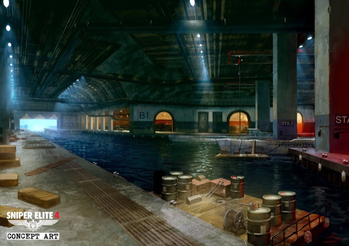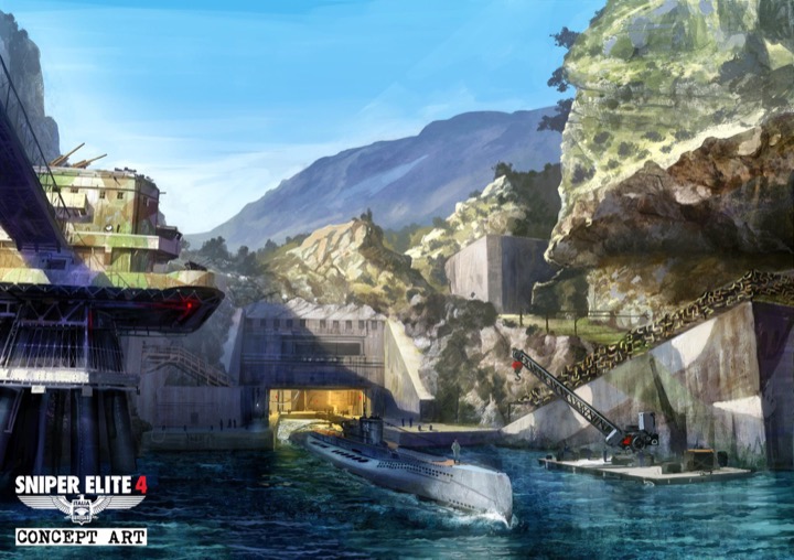 Rebellion旗下“狙击精英”系列新作《狙击精英4》将于2月14日发售。日前,官方公布了一批该作的精美原画,在这批原画中,我们竟然还看到了一个“超级武器”德国纳粹潜艇!据悉本作设定在1943年的意大利,玩家将扮演秘密特工Karl Fairburne,从法西斯的枷锁中解放意大利,破坏德国威胁欧洲的科技力量,比如本次原画图所曝的德国潜艇基地。