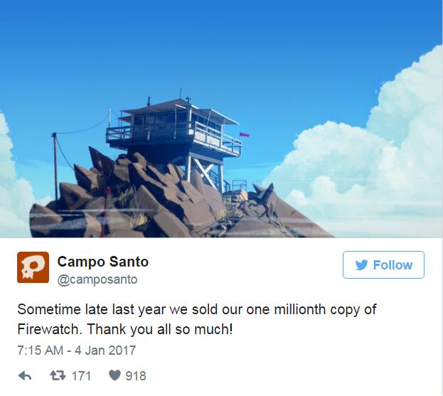 开发商Campo Santo在官方推特上宣布,在去年(2016)末,《看火人》的销量突破了100万份,对此感谢所有支持本作的玩家们。《看火人》现已登陆PS4/Xbox One/PC平台,游戏也在各大媒体以及颁奖礼中备受好评。
