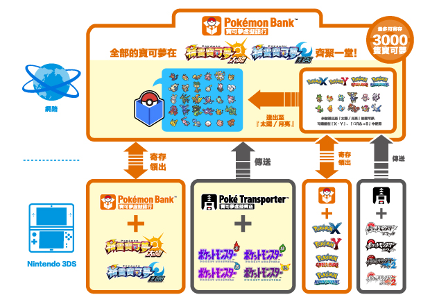 任天堂香港宣布,可进行寄存或领出宝可梦的网路服务“宝可梦虚拟银行”将于1月下旬起开始对应3DS游戏《精灵宝可梦:太阳/月亮》。随着“宝可梦虚拟银行”对应《精灵宝可梦:太阳/月亮》,目前为止没有在《精灵宝可梦:太阳/月亮》中登场的宝可梦们,如今将可以被带到本作中进行对战并一起展开冒险。