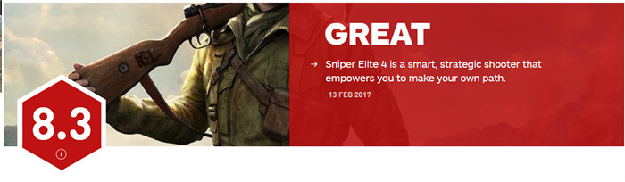 Gamespot和IGN近日正式公布了Rebellion旗下新作《狙击精英4》的评分为8.0以及8.3分!其中Gamespot认为《狙击精英4》的出彩点为“出色的关卡和任务设计”、“具有多功能的扩展武器库”、“更加完善的角色动作”, 缺点则是“不合逻辑的AI”、“无聊的故事剧情”以及“乏味的竞争多人”。