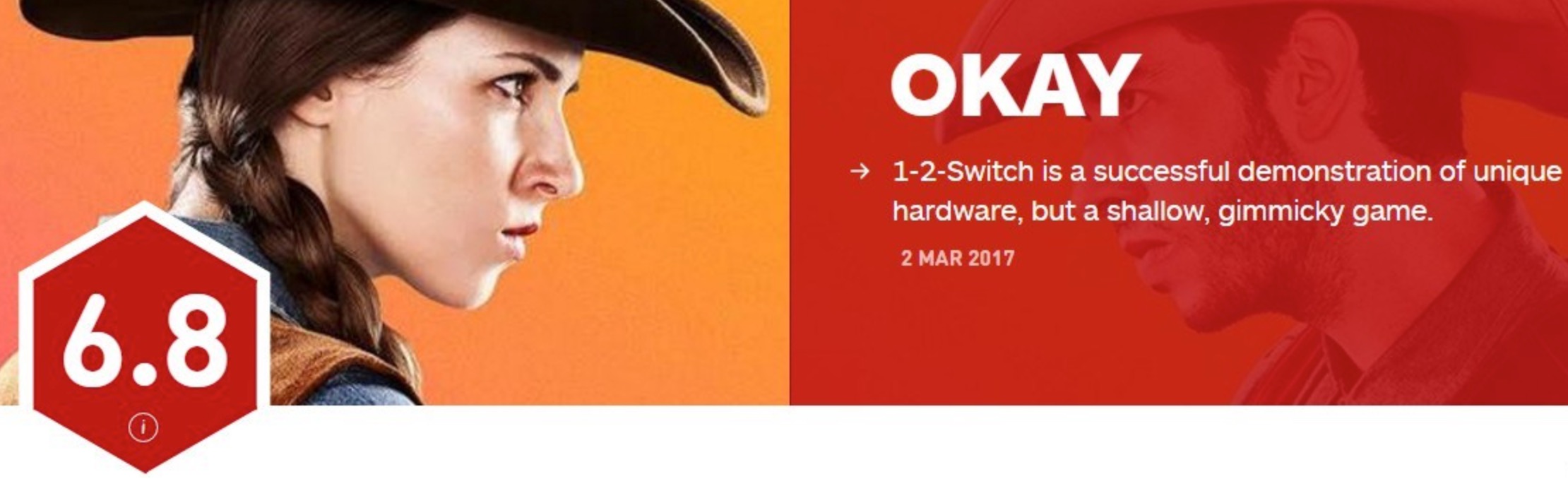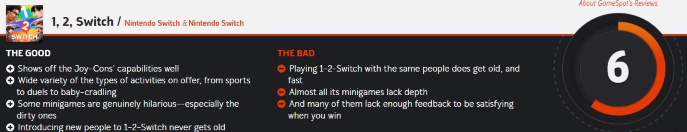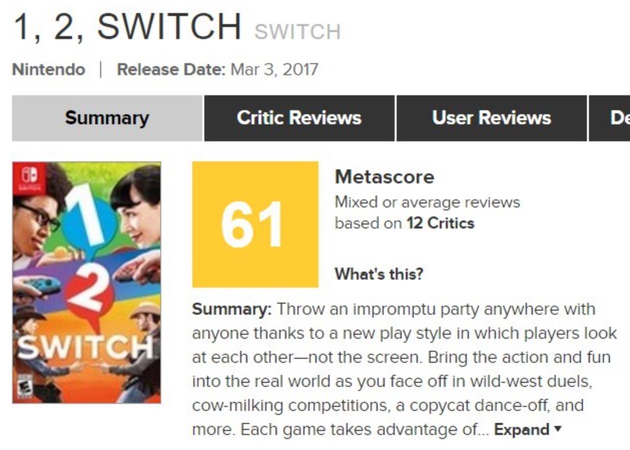 任天堂Switch今天正式发售啦,相比于《塞尔达传说:荒野之息》几乎全满分的媒体评价,同时首发登陆Switch的另一款游戏《1-2 Switch》则只得到6~7分的评价,Metacritic媒体综合评分61(满分100)。其中Gamespot打了6分,IGN则为本作打了6.8分,认为《1-2 Switch》的主要任务就是来介绍这款主机的硬件,游戏的内容缺乏深度,游戏在玩过一次之后就很难再提起兴致了。