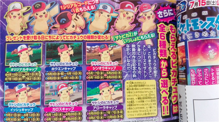 任天堂近日宣布,精灵宝可梦20周年纪念剧场版《精灵宝可梦:就决定是你了!》的预售劵序号可在3DS游戏《精灵宝可梦:太阳/月亮》中兑换“小智的皮卡丘”,不过这次一共有6只不同版本的“小智的皮卡丘”,因此如果要全部入手的话,就必须要购买6张不同时间段的电影预售票!
