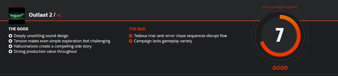 IGN和GameSpot今日给出了《逃生2》的评分,分别是IGN 8.3分,GameSpot 7分。IGN表示,尽管游戏想要表达的宏大的主题在游戏世界中的表现并不那么协调,但《逃生2》还是具备一些其他恐怖游戏所没有的特质。GameSpot认为《逃生2》的优点在于拥有非常优秀的音效设计,紧张感让整个探索过程变得更有挑战性,游戏中的幻觉创造出了引人入胜支线故事;整体具有较高的制作水准;缺点在于冗长单调的试错机制严重影响了流程的流畅度,而且游戏的游玩方式较为单一。目前,游戏在MetaCritic网站的平均分暂为77分,有27家媒体分数作为参考。