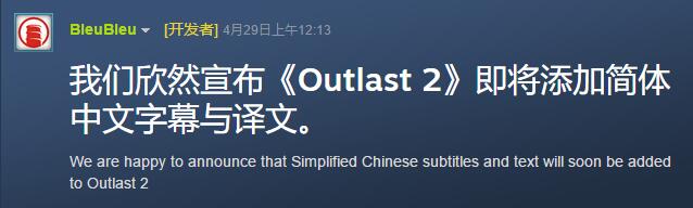 《逃生2》官方日前在Steam讨论区置顶帖中表示“我们欣然宣布《Outlast 2》即将添加简体中文字幕与译文”,相信Steam版《逃生2》很快就获得官方中文支持,目前并不知晓主机版本是否会同步获得支持。
