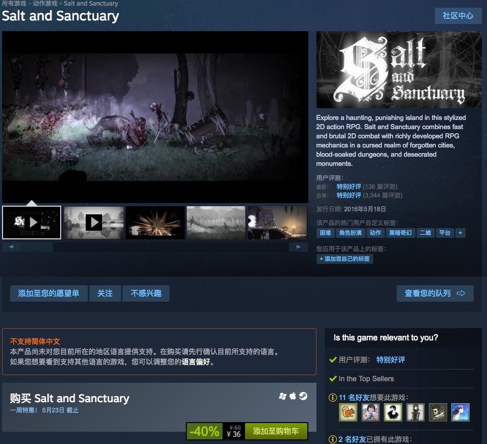 被称为横版魂的2D ACT游戏《盐与避难所》目前在Steam周期折扣中打破了历史低价,目前售价为36元,而且游戏虽然商店页面显示没有中文,但实际上开发商已经在游戏内加入测试的中文汉化。游戏支持Windows,Mac和Linux三个平台,没有什么理由再不入手啦!