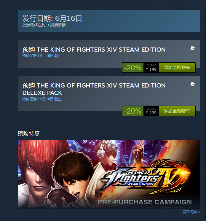 《拳皇14》Steam版确定将于2017年6月16日正式发售,除了包含游戏正篇及2件DLC服装的普通版以外;更有包含追加DLC角色4名,DLC服装10套等STEAM版限定特典的豪华版。目前国区普通版预购价为199元,豪华版预购价为239元。