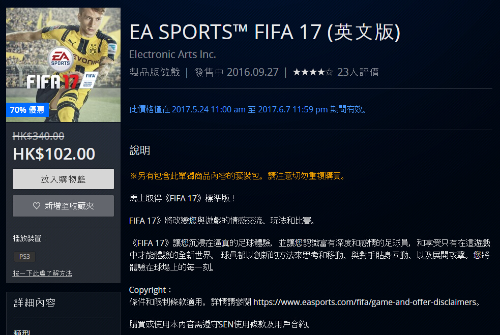 PSN港服商店今日宣布,自今日起至2017年6月7日期间,《FIFA 17》将进行促销活动,PS3《FIFA 17》英文版限时特惠价102港币,PS4《FIFA 17》中文版限时特惠价130.21港币。