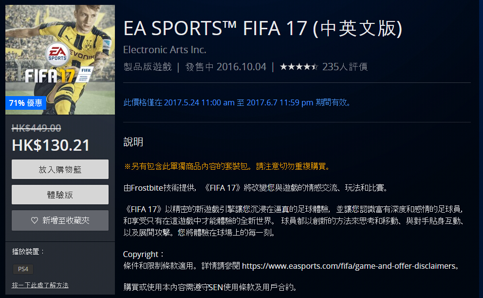 PSN港服商店推出《FIFA 17》限时特惠活动