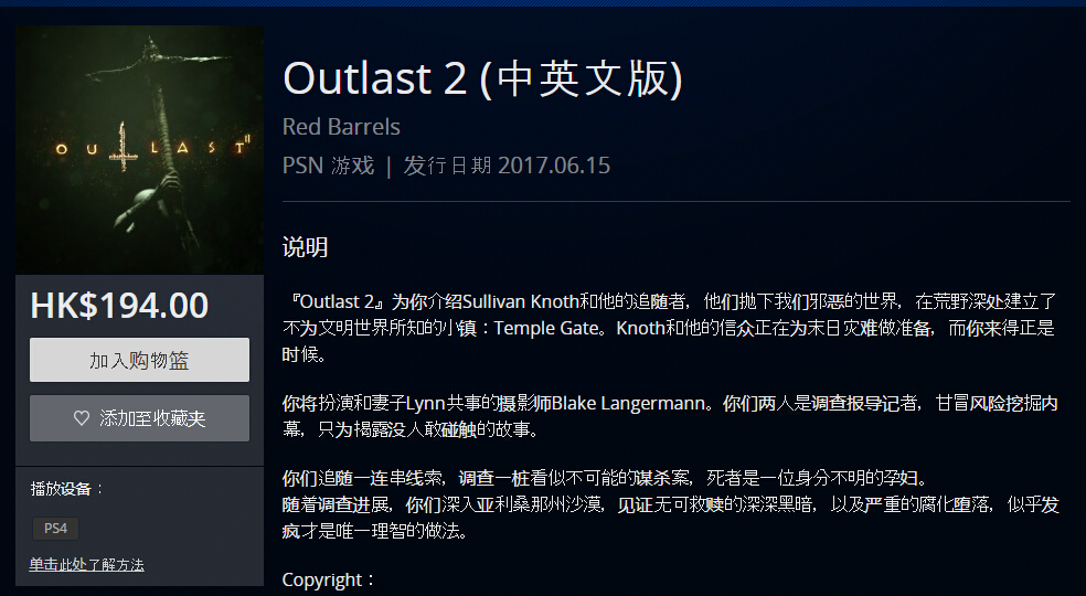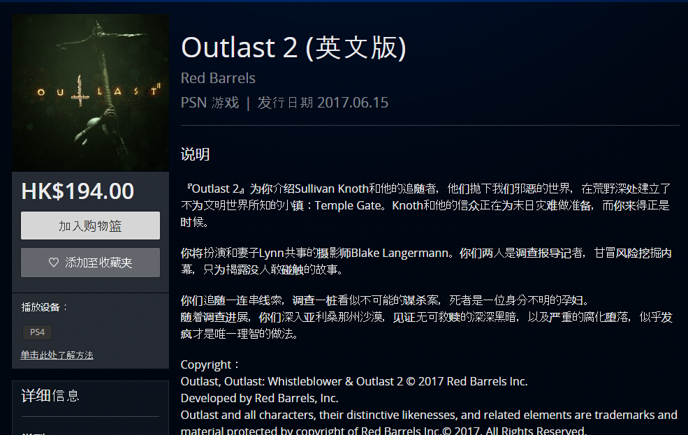 #更新3.0#目前港服商店中原先的“《逃生2》中英文版”已经更改为“《逃生2》英文版”,大致可以判断是一次乌龙事件了,需要退款的玩家,可以拨打PSN港服客服热线进行退款,客服热线为:00852(区号)+2341 2356,接待时间为每周一至六的10:00~19:00。
