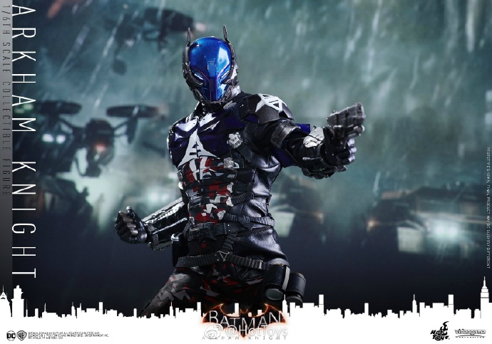 Hot Toys宣布将推出《蝙蝠侠:阿卡姆骑士》的阿卡姆骑士1:6比例珍藏人偶,该人偶最大的卖点是配备了红头罩造型的头盔和红色装甲以供玩家自行替换,整个头盔涂装上金属红色,同样印有仿电脑图案;Hot Toys 更特别於可替换的红色装甲上加重了旧化效果,粉丝们可将红头罩与蝙蝠侠对决的一幕完美重现!武器配件方面,随人偶附有一把小型手枪丶两把中型手枪,以及一把为红头罩造型配置的追击枪,同时配有9只手掌以供替换丶一个人偶地台和一张背景咭纸,丰富的武器装备让粉丝们能呈现电玩真实感。