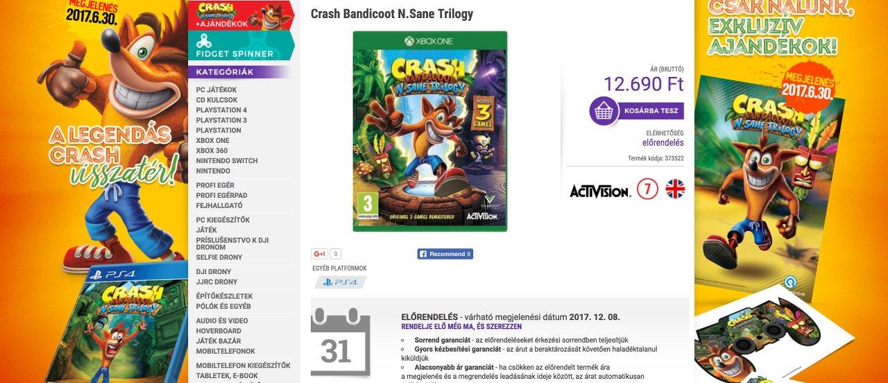 动视旗下游戏《古惑狼:疯狂三部曲》即将于明日正式登陆PS4平台,不过此前有传闻称本作在PS4平台上为限时独占,而今日匈牙利零售商SuperGamer上架了本作的Xbox One版本页面,并显示Xbox One版将于2017年12月8日发售。