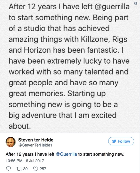 《杀戮地带:暗影坠落》的游戏总监Steven ter Heide日前宣布离开了工作12年的Guerrilla工作室,Steven曾参与制作《杀戮地带》系列、《RIGS:机械化战斗联盟》、《地平线:重返黎明》等多款游戏,他在推特上表示离开老东家是为了尝试一些“新的东西”,而Guerrilla工作室也发长文感谢这位多年伴随工作室和索尼互娱成长的老员工。目前暂不清楚Steven提到的“新东西”是否指的是新游戏项目。