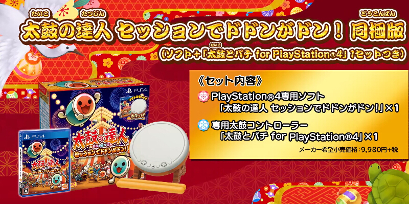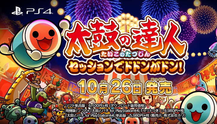 Bandai Namco今日公布PS4平台太鼓达人系列新作《太鼓达人 咚咚喀咚大合奏》将于2017年10月26日发售,售价6100日元+税。据悉本作预计将于2017年发售,将包含“残酷天使的行动纲领”、“前前前世”、“女々しくて”等70首以上的热门歌曲,哆啦A梦也将在本作中登场。此外专属外设配备同捆版也确定将发售,售价9980日元+税,专属外设配备单独购买价为5980日元+税。