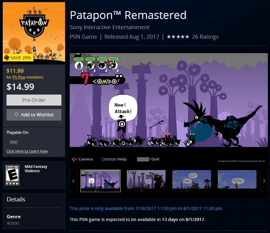 PSP经典游戏《啪嗒砰》PS4重制版将于8月1日发售,现已登陆PSN美服商店