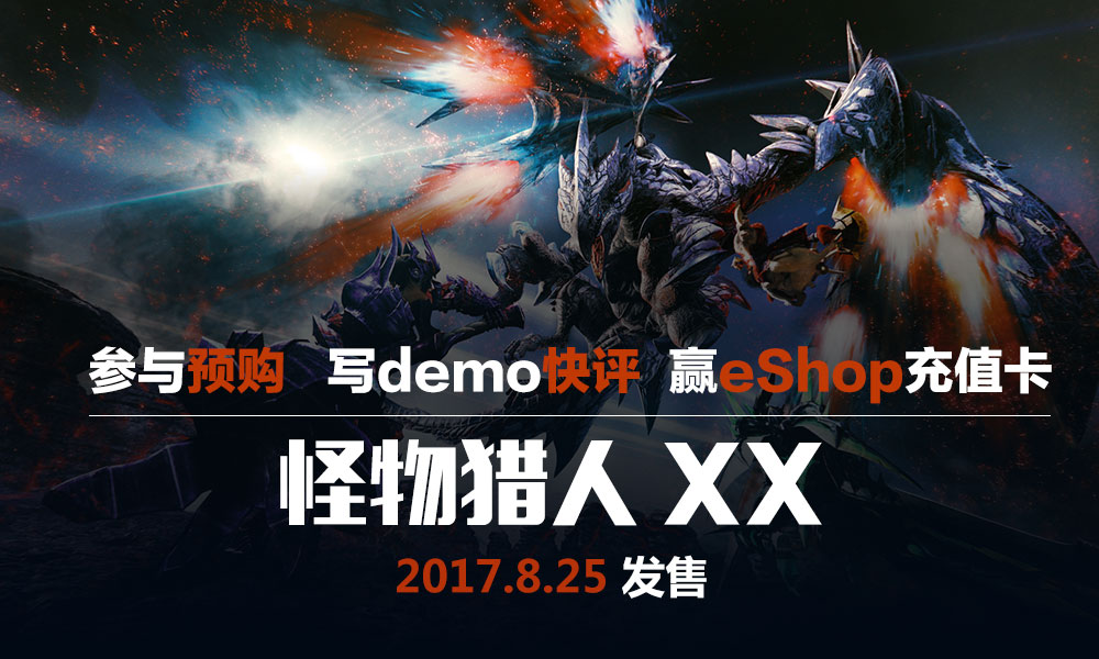 Switch版《怪物猎人XX》即将于2017年8月10日开放试玩Demo下载,相信各位猎人们已经等候多时了。本次Demo将包含讨伐天慧龙在内的三个任务,同时支持本地4名玩家一起游玩,那么在体验完Demo后,你有什么想说的吗?赶紧来参加我们的活动赢取eShop充值卡吧!