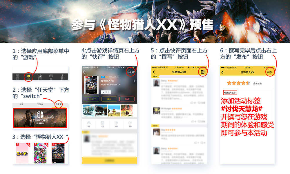 条件二 : 发布《怪物猎人XX》Demo快评,写出自己的感受,发布快评时一定要添加活动标签#讨伐天慧龙#。