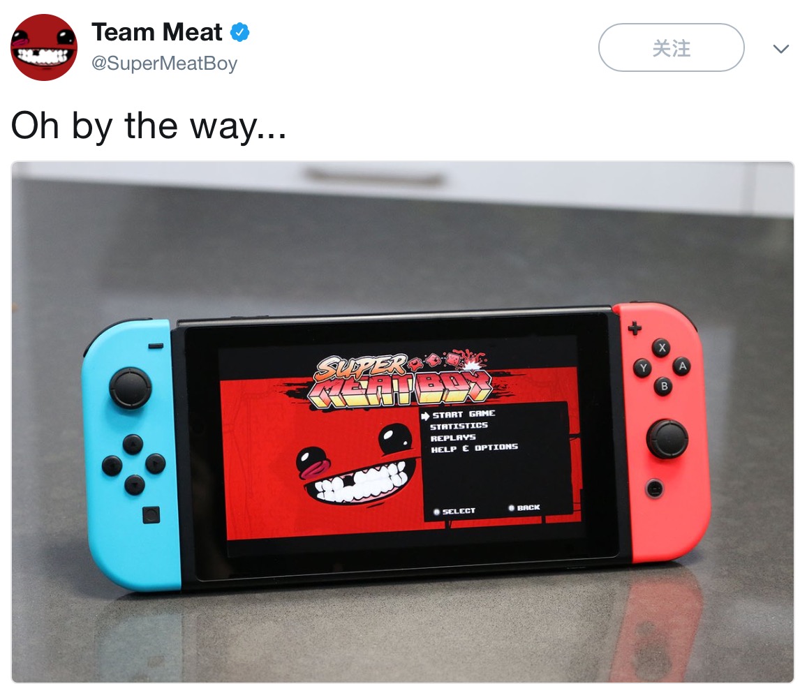 #更新#除此之外,在3DS上大获好评的《泥土突变体》也将登陆NS平台。#原文#此前我们曾经报道过《超级食肉男孩》制作人在推特上对于Nintendo Switch版模糊的态度,而今天游戏制作组Team Meat终于正式通过推特公布,《超级食肉男孩》将会登陆Nintendo Switch。负责移植工作的是之前将本作移植到WiiU平台的Blitworks工作室。