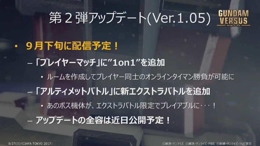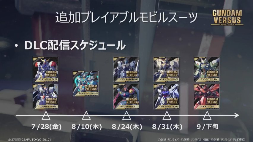 #更新:官方正式公布# PS4《高达VERSUS》将在9月下旬加入“夜莺”与“幻影高达”,均售价602日元+税,并且之后将会在Player Match模式更新“1 on 1”。