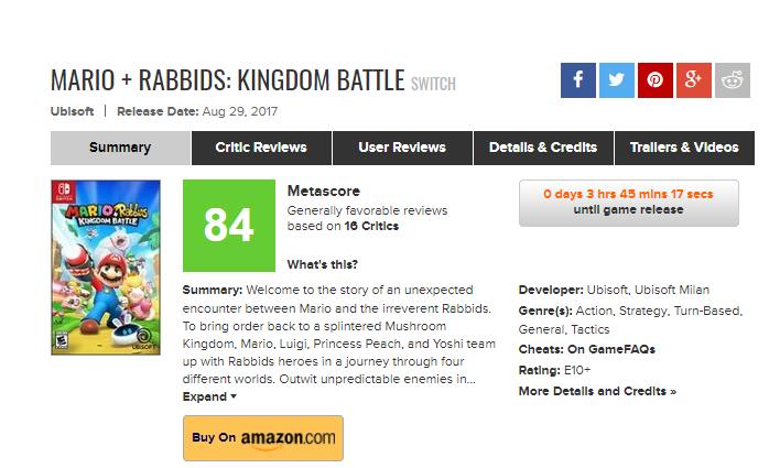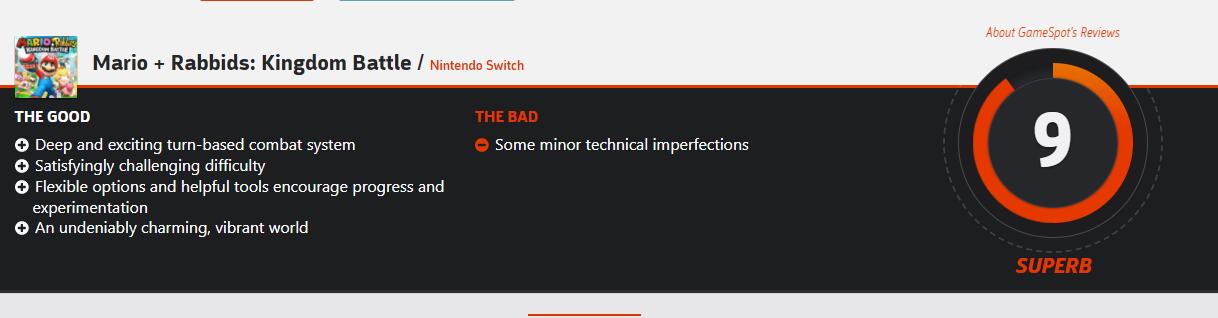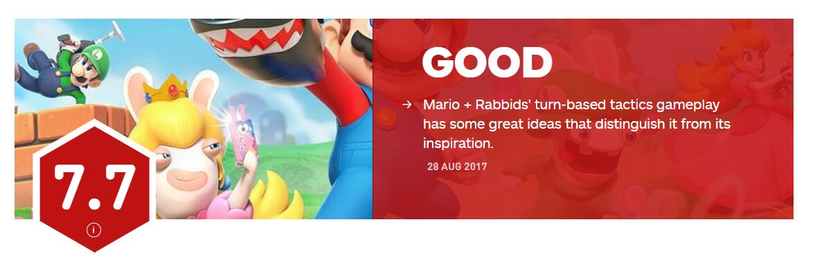 #啊N真的很严格# 《马里奥和疯狂兔子:王国大战》媒体评分正式解禁,目前MetaCritic平均分84分。IGN方面为本作给出了7.7分的成绩并表示“《马里奥和疯狂兔子:王国大战》是一款拥有非常出色想法的回合制作品,但是即使是《幽浮》系列的老司机都会认为游戏中有很多极具挑战的难题。一些困难的关卡更是举步维艰,但是出色的敌人、物品、以及角色能力的搭配使游戏非常有趣。”GameSpot方面为游戏给出了9分的出色成绩,并认为游戏的优点有:有深度并且刺激的回合制战斗系统、让人满意的难度设置、灵活的选项以及有帮助的道具鼓励玩家尝试不同的玩法、充满灵性并且有吸引力的世界,缺点则是游戏中存在的一些“小的技术缺陷”。
