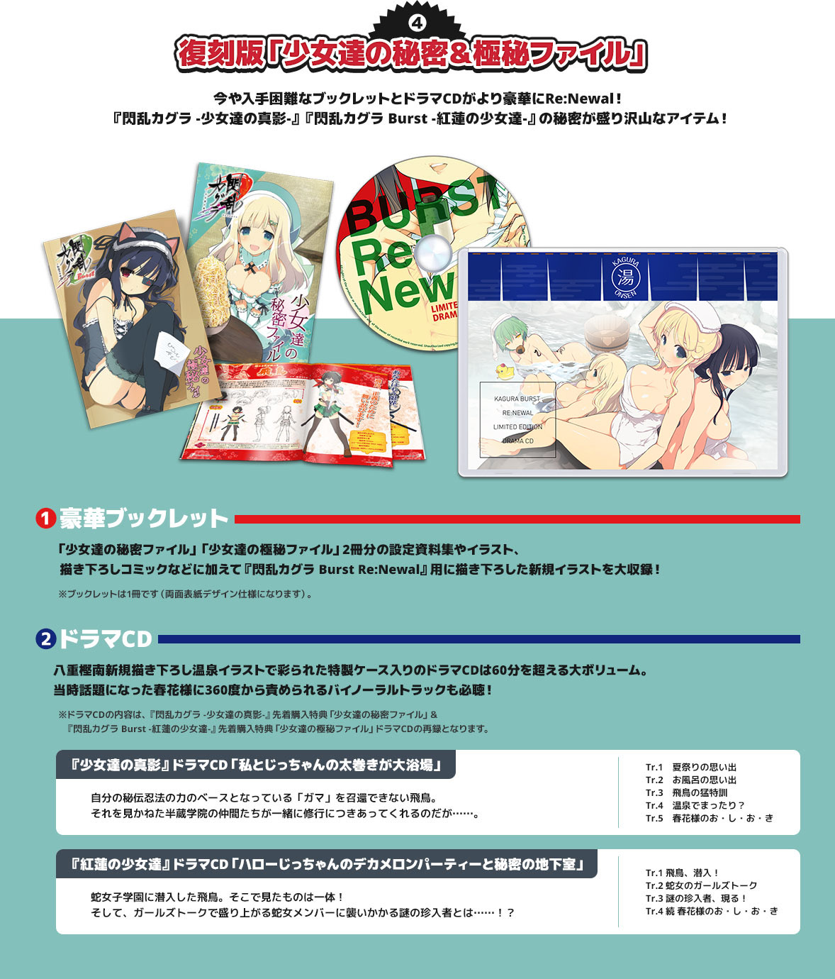 Marvelous今日公布了PS4游戏《闪乱神乐Burst Re:Newal》限定版内容的正式图,据悉本次的限定版将包含八重樫南绘制的特殊包装盒、特制游戏封面、2人1组的挂饰(6个)、复刻版《少女们的秘密&极密文件》、5个特别DLC兑换码(包含雪泉先行使用权、原声主题曲、服装兑换码等),售价10810日元+税。