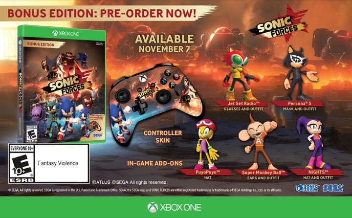 世嘉宣布《索尼克:力量》欧美地区将于11月7日发售,日本地区则为11月9日,预购PS4、Xbox One和Switch平台的《索尼克:力量》可以得到相应平台的手柄贴纸、13个服装道具饰品(饰品出自世嘉经典游戏角色)。《索尼克:力量》数字版预购也即将开放。