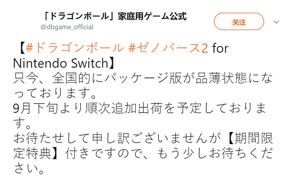 《龙珠:超宇宙2》Switch版在日本地区首发相当成功,Bandai Namco官方今日表示目前《龙珠:超宇宙2》Switch版实体版已经全部售完,下一批将在9月下旬出货,建议等不及的玩家们可以选择下载版。