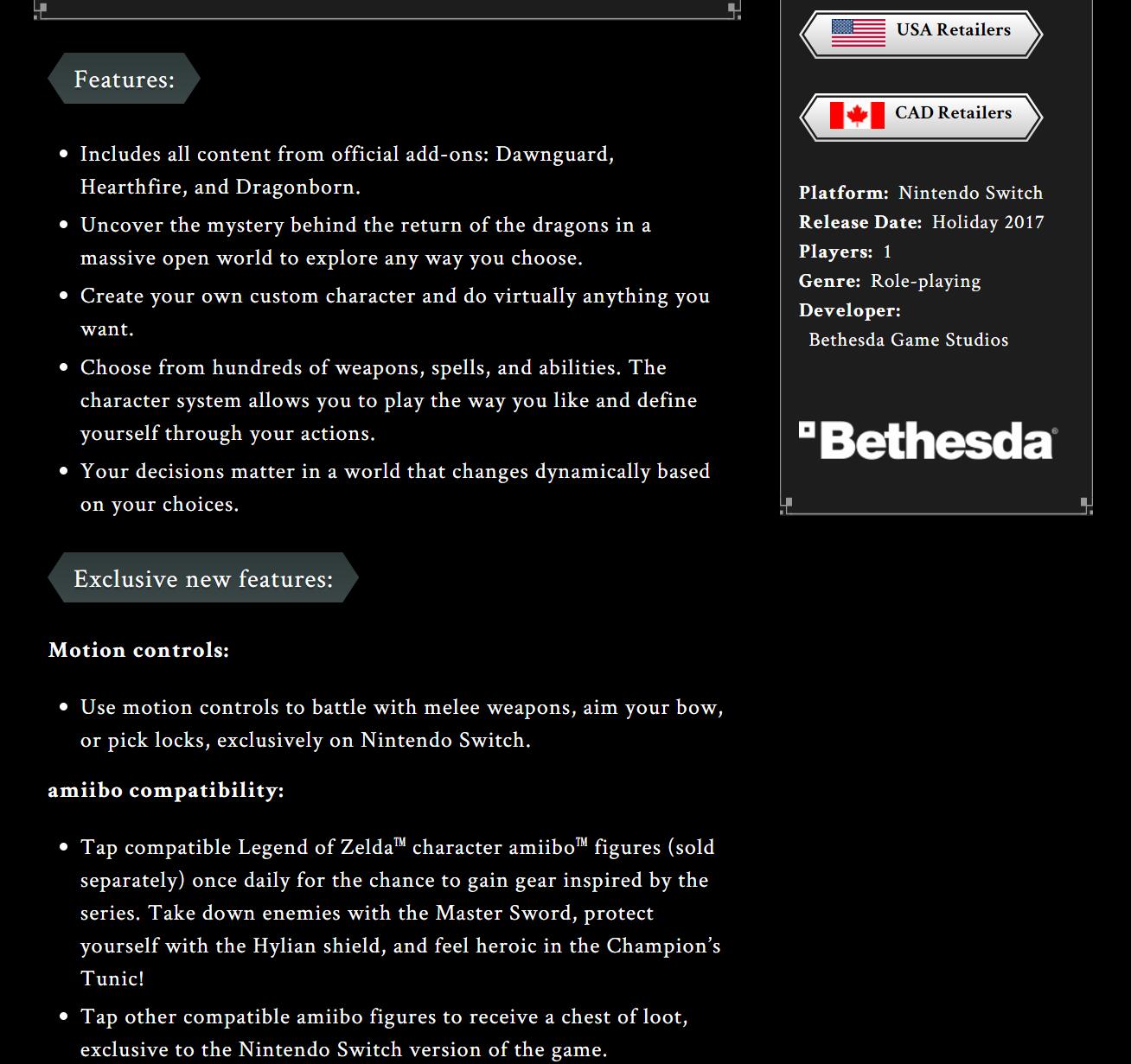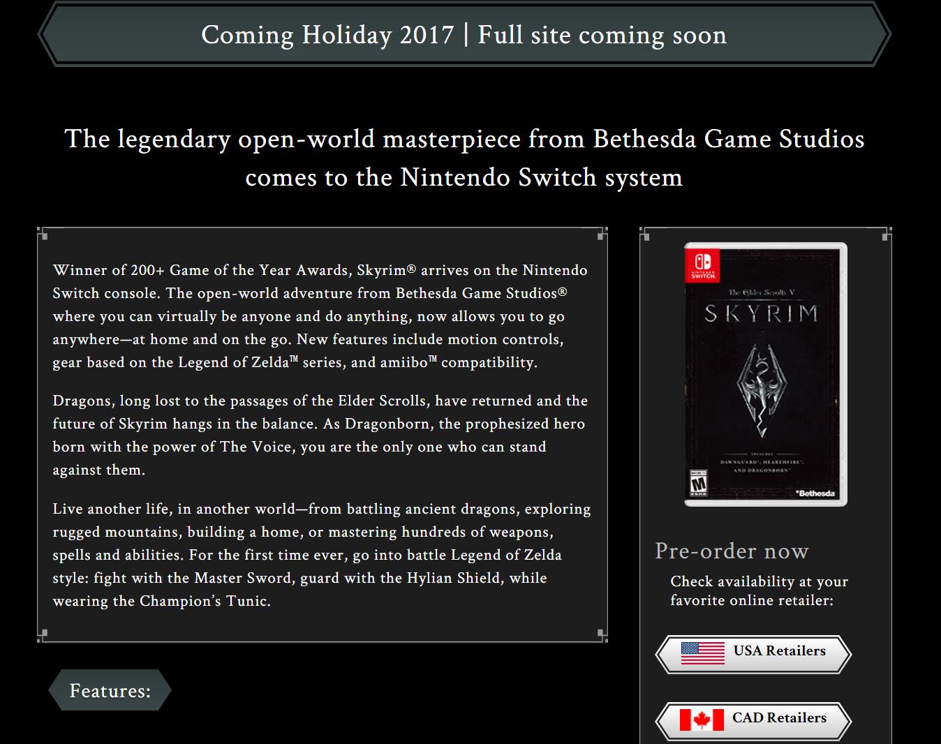 虽然还未公布具体的发售日,但任天堂北美已经上线了NS版本《上古卷轴5:天际》的官方网页。根据官网详情,游戏会包含黎明守护者、炉火和龙裔三个DLC的全部内容,支持体感控制和Amiibo,玩家可通过扫描《塞尔达传说》的Amiibo来获得其联动装备。NS《上古卷轴5:天际》将于2017年冬季上市。
