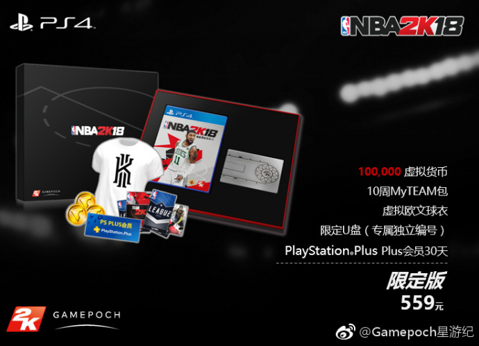 #《NBA 2K18》国行见面会#《NBA 2K18》国行限定版公布,售价559元人民币,除了游戏本体外,还包含100000虚拟货币,10周MyTEAM卡包,Kyrie Ivring服装包,30天PlayStationPlus会员以及专属U盘,每个专属U盘都有独立编号。另外,我们还为大家制作了国行版本与其他版本的对比(图1),方便大家可以更加直观的了解各版本的不同。