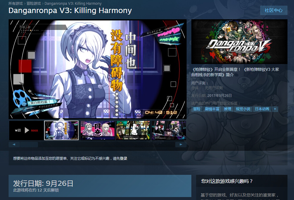 日本游戏公司Spike Chunsoft近日正式开通官方微博,并且宣布旗下游戏《新弹丸论破V3 大家互相残杀的新学期》Steam版确认将支持简/繁体中文字幕,游戏将于9月26日解锁。