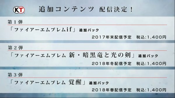 #TGS#Koei Tecom今日公布了《火焰之纹章无双》的DLC内容。DLC将包含“命运”、“新·黑暗龙与光之剑”、“觉醒”三弹内容,将于2017年末开始配信,购买季票的玩家可获得露琪娜的新娘服饰,同时游戏还将加入新的可操作角色。