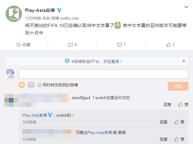 零售商Play-Asia透露,《FIFA 18》Switch版中文字幕支持或将延迟到10月中旬推出